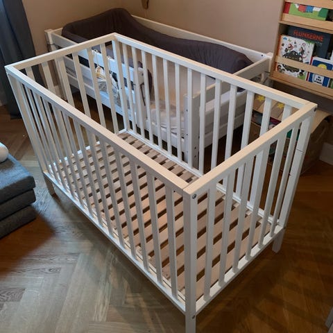 BRIO tremmeseng i træ. Klassisk tremmeseng med tremmer hele vejen rundt og bund i trælameller. Velegnet som seng til baby og småbørn. Farven fremstår mørk. Sengen kan bruges i børneværelset eller som ekstra seng hos bedsteforældre eller i sommerhus. Madras og sengerand medfølger.