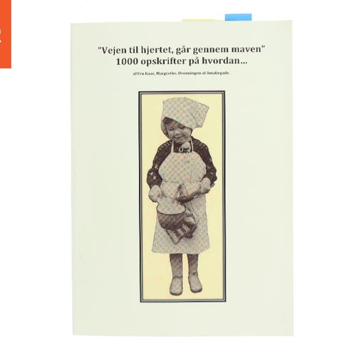 Bogen er en opskriftsbog med titlen "Vejen til hjertet, går gennem maven - 1000 opskrifter på hvordan..." af Fru Kaae, Margrethe. Forsiden viser en illustration af en person i en traditionel kokkedragt. Bogen har tab-indikatorer øverst, hvilket indikerer, at der er forskellige sektioner eller kapitler. Bagsiden indeholder en tekst om vigtigheden af at give og lære taknemmelighed.