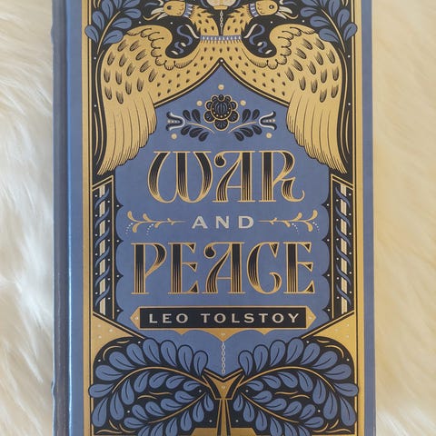 Bogen 'War and Peace' af Leo Tolstoy har en lysebrun hardcover omslag med et dekorativt guld emblemlogo på forsiden. Ryggen har en etiket med bogens titel og forfatterens navn. Bogen ser ud til at være en klassisk udgave uden synligt omslag. Der er ingen synlige illustrationer eller ekstra tekst på bagsiden.