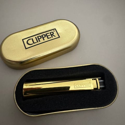 En kompakt lighter, der måler 8,5 cm i længden. . Begge ender af håndtaget er sølvfarvede med en glansfuld finish.
