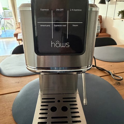 Hâws espressomaskine i rustfrit stål. Maskinen har digitalt betjeningspanel på fronten med knapper til forskellige kaffefunktioner. Udstyret med dampdyse til opskumning af mælk samt aftagelig drypbakke. Medfølgende tilbehør omfatter flere filterholdere/indsatser til brygning af espresso.