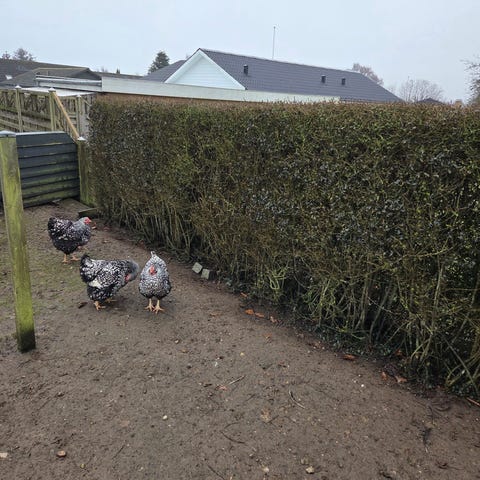 Høns i udendørs hønsegård. Billedet viser flere høns gående i en indhegnet have eller gård med hæk og hegn. Velegnet som illustration af hønsehold i haven, indretning af hønsegård eller lignende brug, hvor der ønskes et visuelt eksempel på fritgående høns i indhegning.