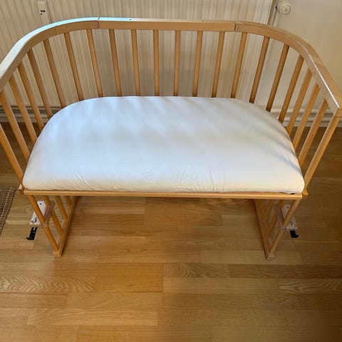 Babybay bedside crib i træ med tremmer og buet form. Sengen kan placeres tæt op ad forældresengen, så barnet ligger ved siden af. Bund med lameller og aftagelig madras. Velegnet som babyseng i de første måneder, hvor der er behov for tæt kontakt om natten.