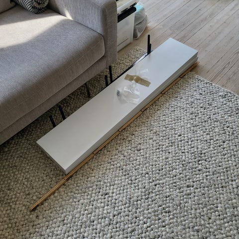 2 stk. Lack hvide svævehylder. Mål: 110 x 26 x 5 cm. Fin stand, dog lidt farveændring på kanten af den ene, derfor den lave pris. Samlet pris 50,00