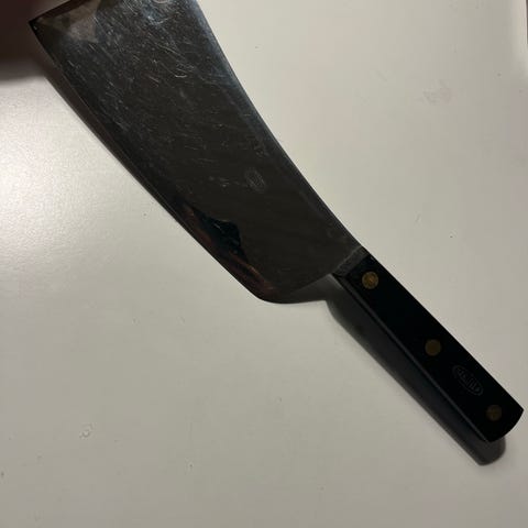 Økse med træskaft og gul håndtag