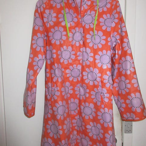 Regn jakke fra Margit Brandt, den har bælte og trykknapper foran, elastik i livet ved bæltet, den har desværre fået en lille plet nederst bagpå se sidste billede. Bryst mål