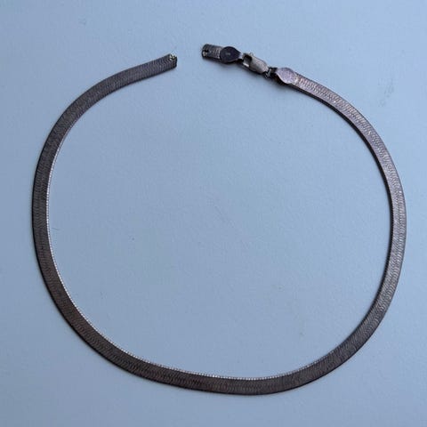 En fleksibel halskæde formet som en slange i sølvfarvet metal. Halskæden er 89 cm i længden og har et glat, kontinuerligt design med små sektioner som ligner skæl. Den er uden synlige låse- eller lukke mekanismer, hvilket fremhæver dens simple og minimalistiske udseende. Tags: halskæde, slange, sølv.
