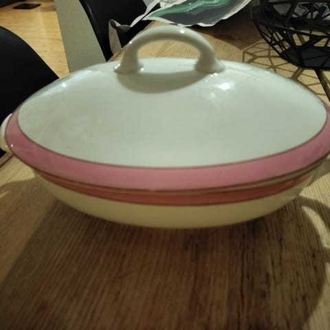 Elegant terrin fra det ikoniske Raili-stel af Arabia, designet af Svea Granlund i 1950’erne. Denne terrin har en diameter på 18 cm og fremstår i god stand uden skår eller revner. Det fine blomster- og guldkantede mønster giver et tidløst og stilfuldt udtryk – perfekt til både hverdag og fest.