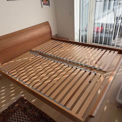 Fin Sengeramme med gavl 180*200 ca 1 lille år gammel med 2 sæt 90*200 nye lösnet lamme bunde ikke pakket ud, sengen sælges uden madras. Sengen er skilt af .