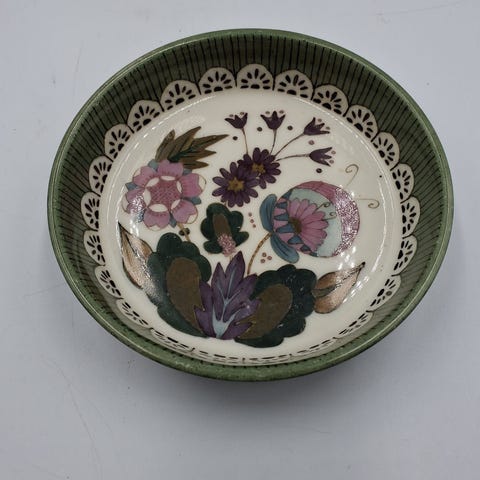 Denne firkantede keramikskål fra royal copenhagen dimensionerne 15x15x3,5 cm. Den har en blå og hvid stribet kant og en indre flade dekoreret med blå blomstermotiver. Skålen kan bruges til servering eller som dekoration.