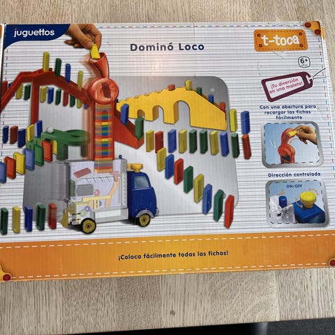Dette er et domino sæt, designet til aktive og nysgerrige børn. Sættet indeholder en række forskellige farvede plastdele, som kan sættes sammen til at arrangere dominobrikker i kreative mønstre og baner. Det inkluderer funktioner som buede stykker, platforme og et maskineri til automatisk opstilling af dominobrikker. Produktet kommer i en let slidt original kasse, som viser instruktioner og billeder af mulige opstillinger.