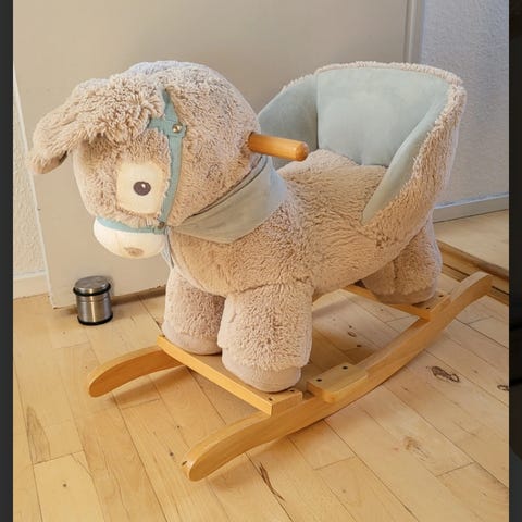 Lille flot brun gyngehest til børn, man kan trykke den på øret så spiller den galloplyde. Standen er næsten som ny.