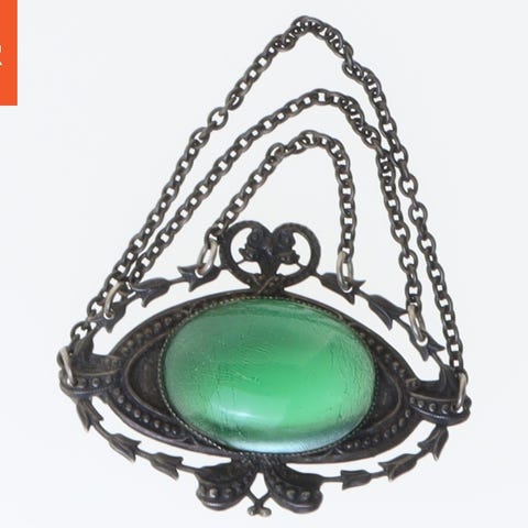 Denne broche har en oval form og er udsmykket med flerfarvede, klare sten, arrangeret i et blomsterlignende mønster med en blomst i midten. Brochen er lavet af metallet med detaljerede udskæringer og et finmasket mønster. Den er udstyret med en traditionel nålelukning bagpå til fastgørelse.