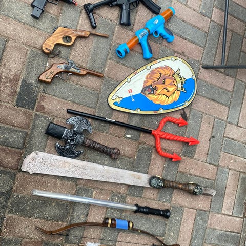 Legetøjsvåben sæt bestående af flere forskellige våben. Sættet indeholder lange plastikvåben med dekorerede klinger samt mindre våben i træ, herunder sværd, økse og spydlignende stav. De træbaserede våben har snore og simple detaljer, egnet til udklædning og rolleleg. Materialerne er primært træ og plastik i natur- og metalfarver. Velegnet til børn, der leger riddere, vikinger eller fantasifigurer under opsyn af voksne.