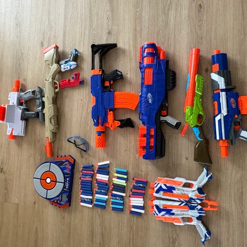 Sælger samlet pakke med 4 Nerf guns (bl.a. Elite 2.0 modeller). Alle er testet og fungerer som de skal. I pæn brugt stand med almindelige brugsspor.