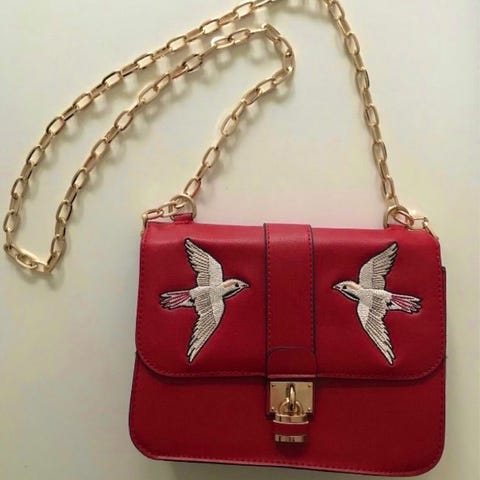 Denne skuldertaske, der måler 33x26 cm, har et violet design med et broderet billede af en fugl på forsiden. Tasken har to spændelukninger foran og en justerbar skulderrem. Bagsiden af tasken er ensfarvet med en lomme uden lynlås.