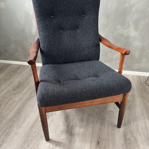 Rigtigt god lænestol med stof i ren uld.