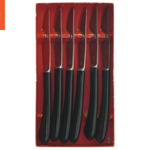 Sæt bestående af seks knive med brun horn skaft. Hver kniv måler 22 cm i længden og knivene er bundet sammen med en snor. Knivene ser ud til at have et moderne design med en udglattet finish på skaftet.