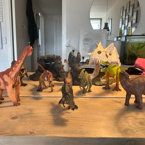 T Rex. Sættet består af mange forskellige dinosaurer i flere størrelser og farver. Figurerne er detaljerede og velegnede som legetøj eller til samling og leg med dinosaurtema. Leveres som et samlet parti som vist på billederne.
