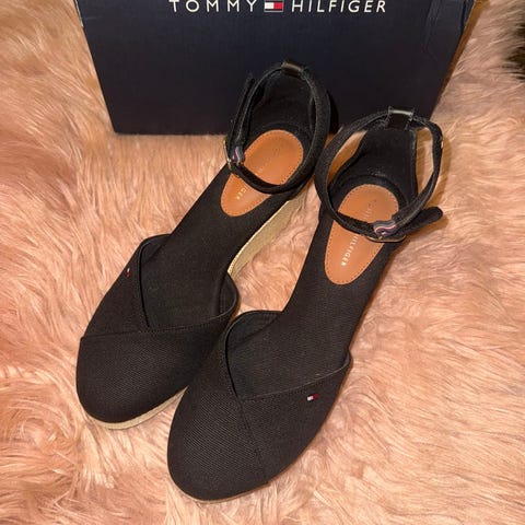 Tommy Hilfiger sandaler med kilehæl i str. 39. Sandalerne er i navy med brune remme og spænde ved anklen. Overdelen har sløjfedetalje foran og lille Tommy Hilfiger-logo. Mellemsålen har flet-/espadrillelook, og sålen er i gummi for bedre fodfæste. Velegnet som sommersandal til hverdag og pænere brug.
