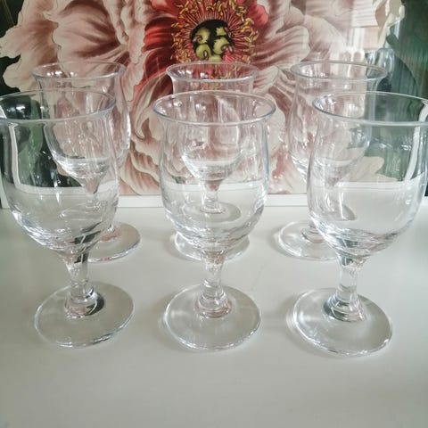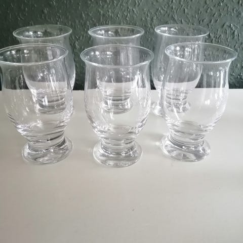 Holmegaard glas med sort fod. Sættet består af 7 klare glas med sort rund fod og håndgraveret ranke mønster i glasset. Velegnet som drikke- eller vandglas ved borddækning i hjemmet.