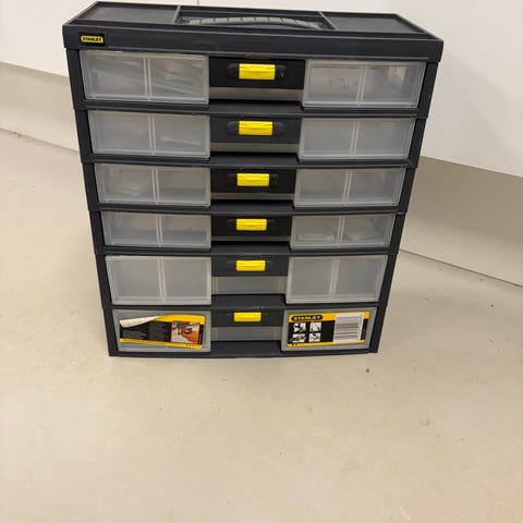 Plastik skuffereol med 24 små skuffer i gennemsigtig plast og grå kabinet. Skufferne er velegnede til opbevaring og sortering af skruer, søm, beslag og andre småting i værksted, hobbyrum eller garage. Skuffereolen kan placeres på bord eller hylde og giver et samlet overblik over indholdet gennem de klare skuffer med etiketter på fronten. Med indhold