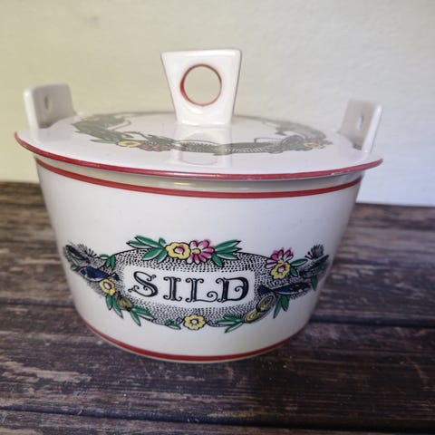 Keramik, Sildekrukke, Aksini, Aksini krukke - perfekt til silden på julebordet. Fra. Aksinis serie med kokken. Bortset fra et minihak i kanten på låget er den i fin stand - også indvendig. . Højde 9,5cm og diameter 14cm.