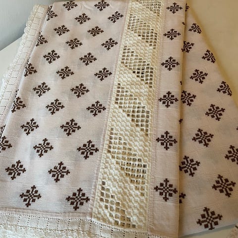 Broderet (maskine) dug med servietter i lys grøn farve. Tekstilerne har et diskret mønster broderet i en mørkere nuance. Sættet omfatter en større dug samt matchende 12 servietter i samme materiale og design. Velegnet til brug på spisebord eller andre borde, hvor der ønskes et ensartet udtryk mellem dug og servietter.