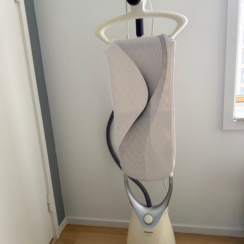 Philips tøjdamper i gulvmodel med integreret lodret bræt. Enheden har damphoved foroven, fleksibel slange og base med vandbeholder forneden. Egnet til opfriskning og udglatning af hængende tøj, skjorter, kjoler og andre tekstiler. Justerbar stang gør det muligt at tilpasse højden til forskellige typer beklædning. Tilsluttes almindelig stikkontakt og anvender vanddamp til at behandle stoffet.
