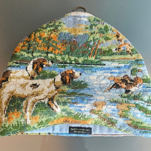 Tehætten tevarmer tekandevarmer. Broderet på 12-trådet? offwhite hørlærred med Dansk garn.