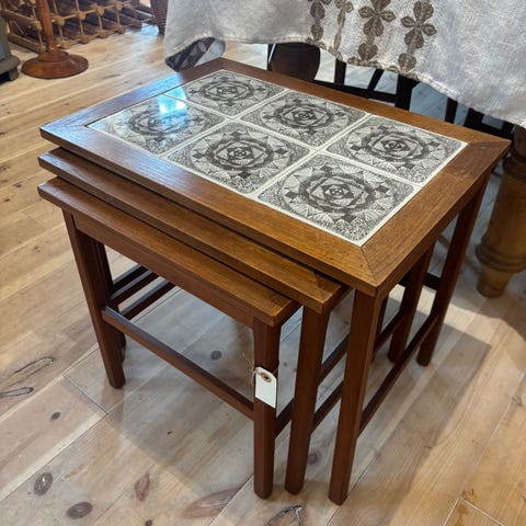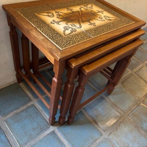 To Indskudsborde i teak og kakler sælges samlet