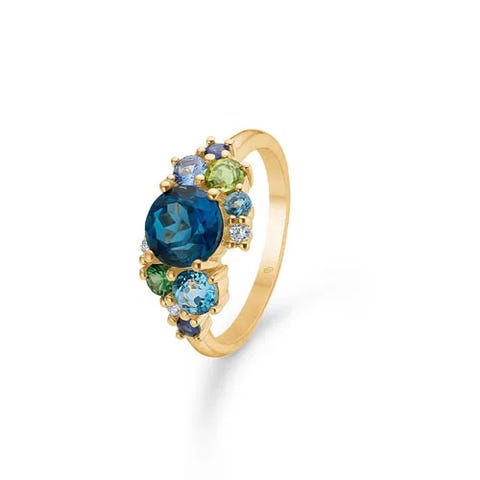 Luxury Rainbow Petite ring i 14 karat guld med brillantslebne safir, rubin, topas, ametyst og turmalin, organisk placeret hele vejen rundt.