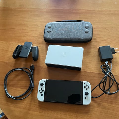 Har aldrig været brugt og fejler intet/har ingen former for brugsspor, derfor fremstår den helt ny trods at den har været ude af kassen. Ingen støv, snavs eller fedtet fingre, alting er helt ren her. Har bare pakket den ud for nogle måneder siden og tændt den. Den virker. Siden har den lagt i kassen, i beskyttet indpakning. Kvittering haves desværre ikke længere. Der medfølger som tilbehør, et case, 2stk skærmbeskyttelse. Flere Micro SD kort, 2stk Sandisk Extreme på 256GB og 2stk på 128 GB, samlet set 768GB, så man kan downloade en masse spil, hvis man ikke er til at samle på de fysiske. Udover det, så er der alt hvad der nu ellers kommer med i pakken når man køber en Nintendo Switch OLED. Ink 30 dages gratis prøveperiode. Ved ikke hvad det er for noget, men går ud fra at man kan prøve nogle forskellige spil, uden at købe dem.
