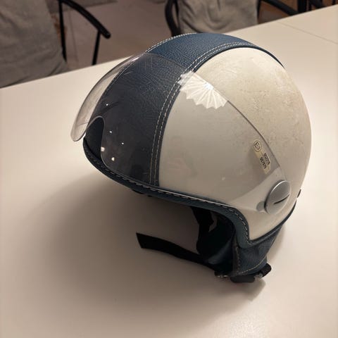 Original Piaggio hjelm i orange/sort design med klassisk vintage look. Klar visir med almindelige brugsspor/ridser (se billeder). Skummet indvendigt smuldrer lidt, så hjelmen sælges primært som den er – oplagt til retro look, pynt eller projekt.