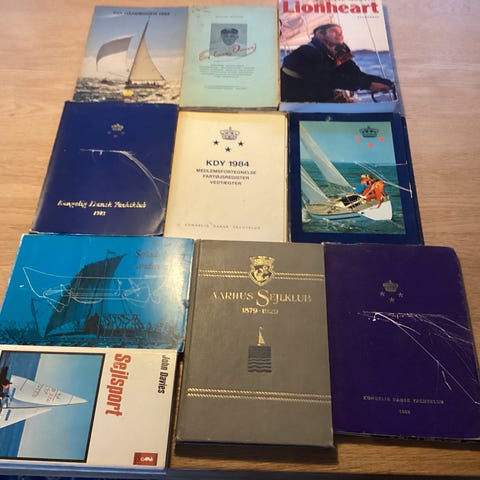 Samling af diverse bøger om sejlads og sejlsport samt flere årbøger fra Kongelig Dansk Yachtklub (KDY). Bøgerne omhandler blandt andet sejlads i hårdt vejr, spilerskæring, tursejlads og kapsejlads, samt historiske og tekniske emner relateret til sejlsport. Velegnet til sejlere og andre med interesse for både, navigation og sejlsportens historie.