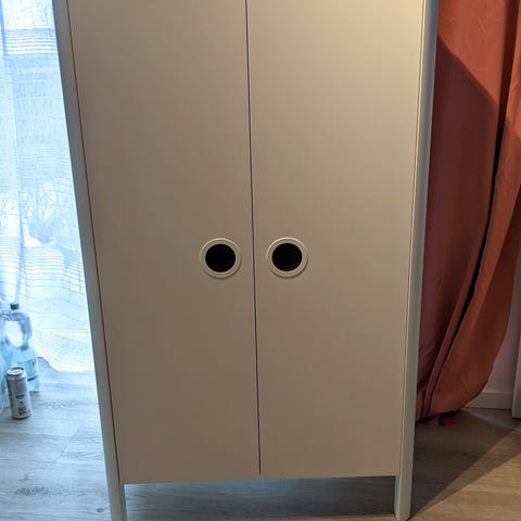 Rigtig fint klædeskab / skab til opbevaring til børneværelset. Fin lyserød farve. Skabet er af mærket Busunge fra IKEA. Der er 3 justerbare hylder samt en tøjstang. (Denne er ikke på mine billeder, men vil være monteret ved køb). Se billede for mål og produktbeskrivelse.