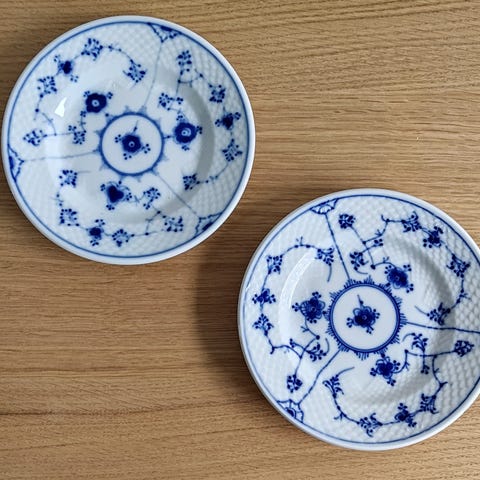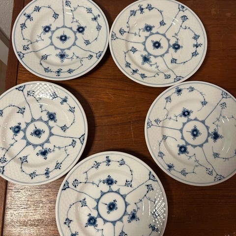 tallerkener i klassisk hvid med blå dekoration. Tallerkenerne har et mønster med blå blomster og ranker samt rillet struktur i porcelænet. Velegnet som middagstallerkener eller serveringsfade i et stel fra b&g med lignende dekoration. 1.sort. Lidt brugsspor. 1 frokost 22cm. 6 middag 24,3cm( 2 24,7cm. Ikke noget som bemærkes det store. Det er trods samme produktionsnummer. 300kr stk