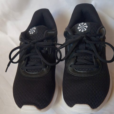Nike React Element sneakers i sort med hvid sål. Skoene har snørelukning og karakteristisk React-sål med gummidetaljer under bunden. Størrelse 38,5 24,5 Velegnet som hverdagssneakers eller til let træning.