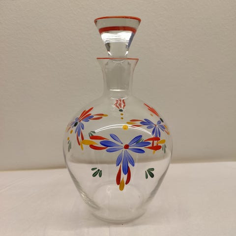 Grøn glas karaffel med smukke lyserøde og blå blomster og dekoreret med lidt "guld"