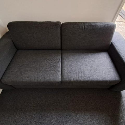 Sovesofa 2-personers i blå polstring med synlig træramme i siderne. Sofaen kan foldes ud til en liggeflade, så den kan bruges som gæsteseng eller ekstra soveplads. Ryglæn og armlæn er polstrede for øget komfort, og trærammen giver et enkelt, funktionelt udtryk, der passer ind i mange typer indretning.