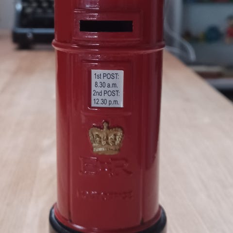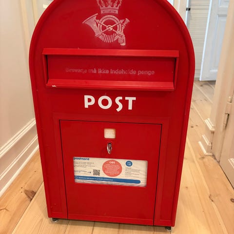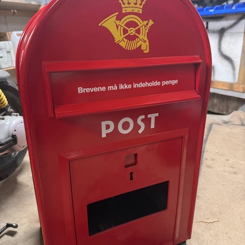 Rød postkasse i metal med lås og nøgle. Klassisk udformning med brevindkast øverst og låge foran til tømning. Velegnet som dekorationsgenstand eller til opbevaring af post i hjem, butik eller kontor. Der er tidens tegn buler på siderne foto. Byd start 3600. - køber betaler forsendelse