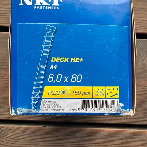 182 stk NKT Deck HE+ terrasseskruer i rustfri A4 (AISI 316).