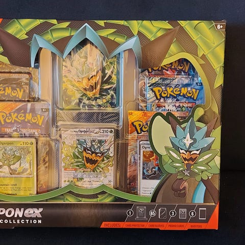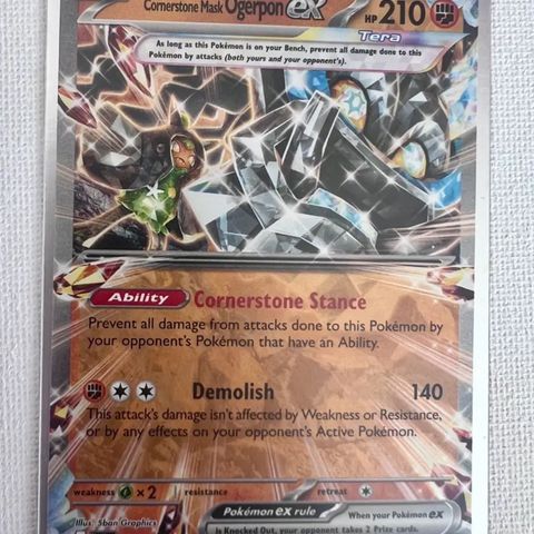 Pokemonkort fra Scarlet and violet twilight Masquerade. Cornerstone Mask Ogerpon Ex samlekort. Holo-kort med angrebene Cornerstone Stance og Demolish. Kortet har 2 guldstjerner og er speciel illustration rare virkelig et flot kort som er pack fresh leveres i sleeve og toploader