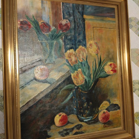 Ældre Mogens Vantore stilleben oliemaleri på lærred i guldramme.