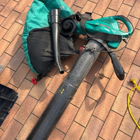 Bosch løvblæser i grøn plast med sort blæserrør. Egnet til oprydning af blade og mindre haveaffald på terrasse, indkørsel og græsplæne. Håndholdt model med greb og betjeningsknapper på toppen. Kan bruges til almindelige haveopgaver omkring huset.