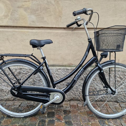 URANIA damebycykel med 52 cm stel og 28"tommer hjul.1 gær.Cyklen har lav indstigning og er egnet til kvinder.Køreklar, perfekt stand.Basta kode lås og batteri lys på.Passe til ca.160-165 cm høj. Udstyret med bagagebærer, kædeskærm og baghjulsskærm i matchende grøn farve. Foran er der monteret cykelkurv på styret. Cyklen har fastmonteret lås på baghjulet og støtteben. Velegnet til daglig transport i byen og korte ture på asfalt og cykelstier.Stel nr.S83442U