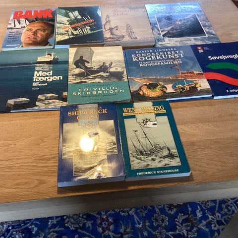 Samling af diverse bøger om sejlads, navigation, skibsfart og dampskibe. Blandt bøgerne ses titler om sejlsport, navigation, skipperlære, ortografi til søs samt historiske værker om danske jernbane-dampskibe. Egnet til læsere med interesse for søfart, sejlads, navigation og maritim historie. Bøgerne dækker både praktiske emner og historiske beskrivelser inden for det maritime område.