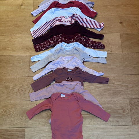 Abercrombie & Fitch babytøj til pige i størrelse 56 i lyserøde nuancer. Sættet omfatter forskellige dele babytøj som dragter, bukser og overdele, velegnet til spædbørn. Farvetonerne er primært lyserøde, suppleret med enkelte lyse og hvide dele. Tøjet er beregnet til en lille pige i str. 56 og kan bruges som basisgarderobe til hverdag og søvn.