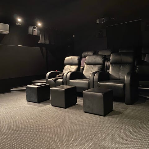 Recliner lænestole i gråt stof. Lænestolene har polstrede armlæn og høj ryg. Begge stole har indbygget fodstøtte, der kan slås op, så man kan sidde tilbagelænet. Stolenes drejefod ses bagpå på den ene stol. Velegnet som tv- eller læsestole i stue eller opholdsrum.