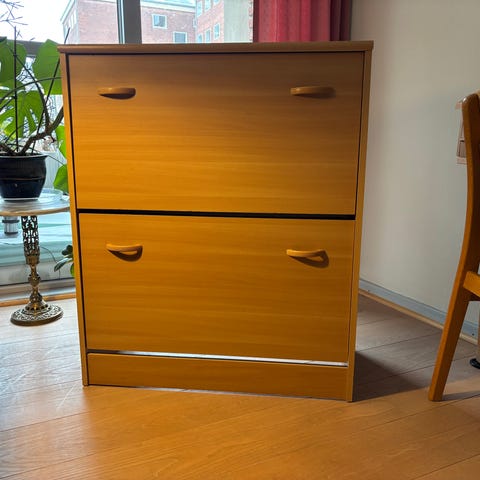 Fedt retro skab til sko og en hylde til sex nøgler pung osv man lige skal af med når du kommer ind af døren.